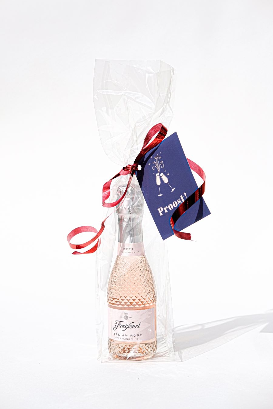 Feestelijk cadeau: mini flesje prosecco Freixenet Rosé verpakt in doorschijnende folie, krullint goudkleurig en met een gepersonaliseerd A7 kaartje.